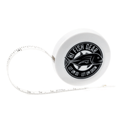 White Plastic with Vinyl push button retractable tape measure with inches on one side and centimeters on the other. Side features HiFishGear logo with "Let Um Go, Let um Grow"