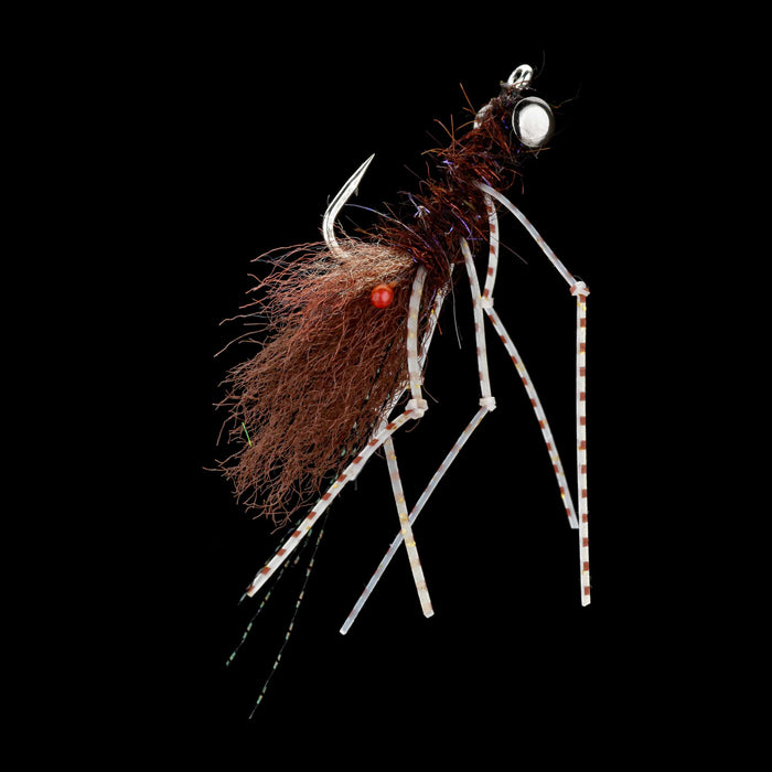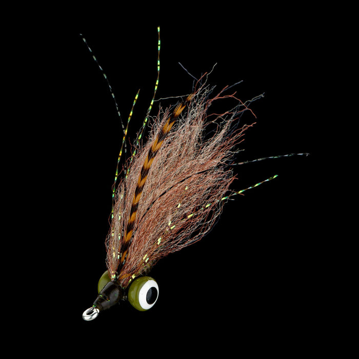Makai Flyz Crazies - Crazy Charlie pattern tied with EP fibers and large lead dumbbell eyes on a Gamakatsu SL113H 3X Strong size 6 hook. Available in 3 colorways (Olive, Orange, Brown). Length 1.5in, Weight 2g.